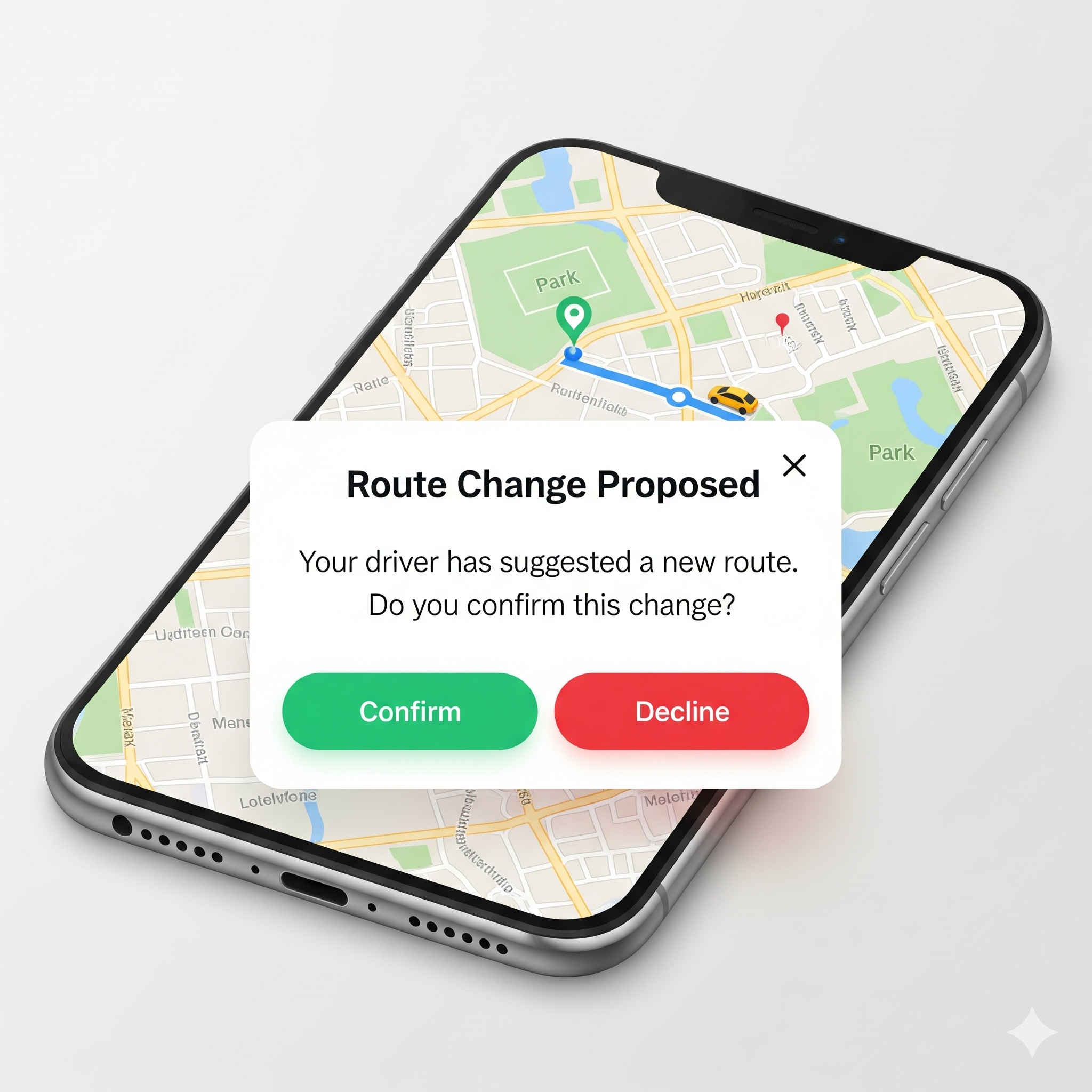Driver-initiated deviation: If a driver adjusts the route during a trip, the passenger receives a notification: "Your driver has suggested a route change. Accept / Decline / Chat with driver."